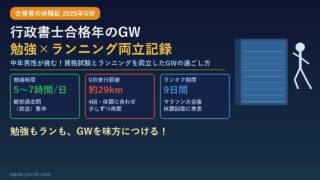 行政書士試験に合格した年のGWを振り返ります。長野マラソン後の体調不良でランニングを控えた分、肢別過去問(民法)を1日5〜7時間こなす勉強法を実践。GW明けからの模試活用や今年のGW計画も紹介します。