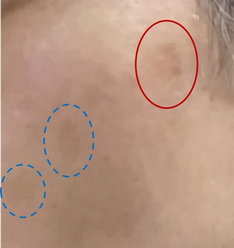顔に出来たシミで、目立つのは顔の左側のこめかみから頬にかけてです。